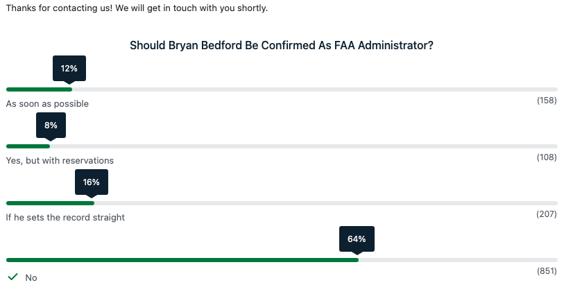 AvWeb’s poll indicates a sound repudiation of Bryan Bedford. However, if only the Senate will listen and abide by their constituents.