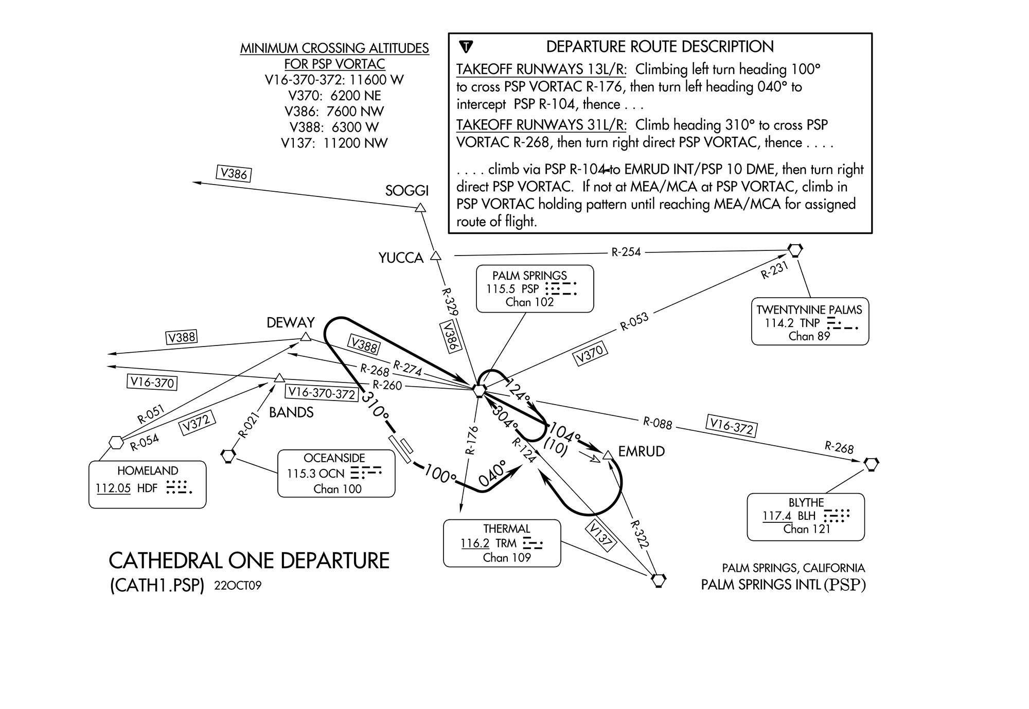 As an East Coast pilot, my concept of mountains is a lot different from that of my West-Coast friends. So, when I sat down at my sim in a Piper Arrow at the Palm Springs International Airport (KPSP) staring at the CATHEDRAL ONE departure procedure, panic ensued. As you can see from the chart, “there be dragons” in the form of high mountainous terrain practically in all directions except the southeast (aren’t we in the desert?). You don’t really have to be a TERPs specialist to understand why this SID was designed the way it was—clearly, the gist of this procedure is to keep you to the southeast as you climb to a safe IFR altitude. If I’m taking off from RWY 31L, the minimum climb gradient is 386 feet per NM which at 100 knots is 643 FPM—no issue for the Arrow (or even a 172 for that matter) with a field elevation just under 500 FT.